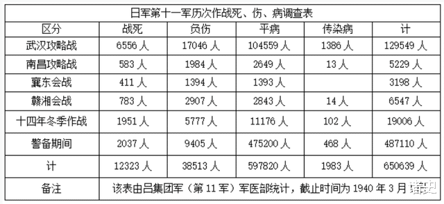 学者杨晓辰找到一份日军第11军从1938年到1940年历次作战的伤一火看望表,其中伤一火数据就与日军战报中大不一样,具体笃定见下表。在武汉会战中,日军第11军战死6556东说念主、负伤17046东说念主、平病104559东说念主、传染病1386东说念主,因此伤一火为23602东说念主,战病朝上10万。