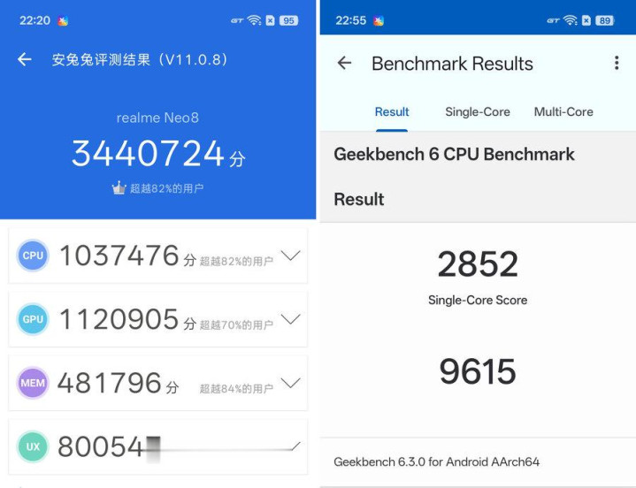 性能是真我Neo8的中枢竞争力,第五代骁龙8旗舰芯与行业唯一极客性能面板的组合,带来行业最解放的性能开释。硬件层面,该芯片领受第五代骁龙8至尊版同款台积电3nm制程与2×3.8GHz+6×3.32GHz全大核架构,搭配LPDDR5X内存与UFS4.1闪存构成性能铁三角,实测在安兔兔V11版块跑分简陋突破344万分,远超同档机型。