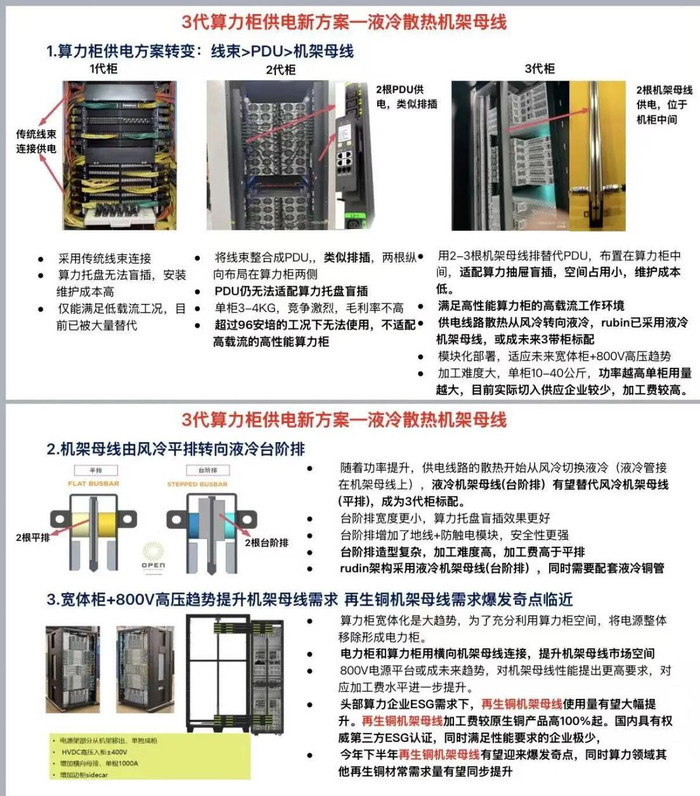 供电廓清散热从风冷切向液冷(液冷管接在机架母线上),rubin已禁受液冷机架母线(台阶排),台阶排或将成为3代柜标配。