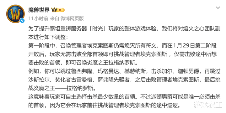魔兽全国时光服的熔火之心其实依然上线了比较长一段时分了,比拟于之前的怀旧服来说,魔兽全国时光服的雷火逼迫相对来说比较克制一些,而当今雷火终于驱动对熔火之心动刀了,不外此次看起来是逼迫,施行上并莫得太多的逼迫,仅仅优化了玩家们打本的时分,以及让玩家们有更好的选拔,不错依据自身情况来选拔旅途,那么此次改了什么呢?