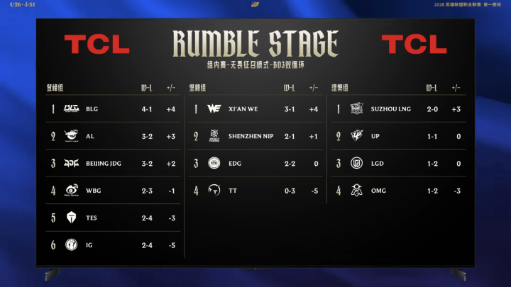 现在的LPL赛区三组战绩中,登峰组因为队列最多,是以竞争也最为强烈,其中BLG此前的四连胜亦然在本周被JDG拦腰斩断,环节照旧被JDG以2-0横扫的,此战也暴清晰了BLG不少亟待科罚的问题,但他们照旧靠着4-1的战绩稳住了榜首。