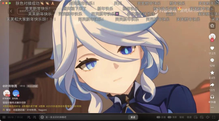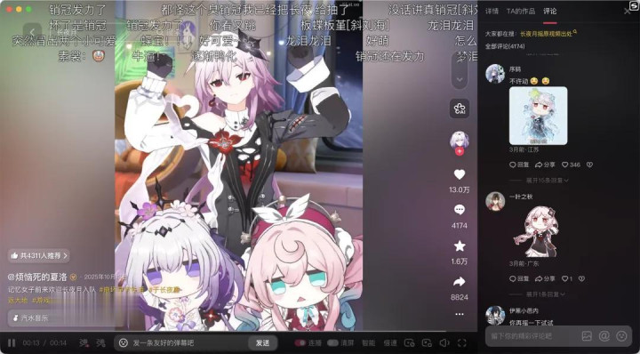 再比如创作家@叶玲秋雨,TA之前就靠《原神》旅行者和芙宁娜的撒糖视频刷屏全网,此次在同好会上推出的新作,相通得益了极高的热度和共识。