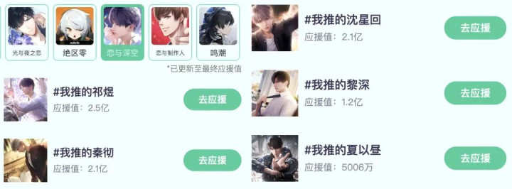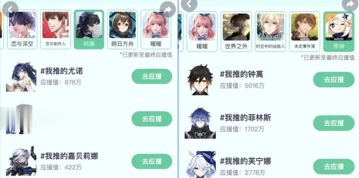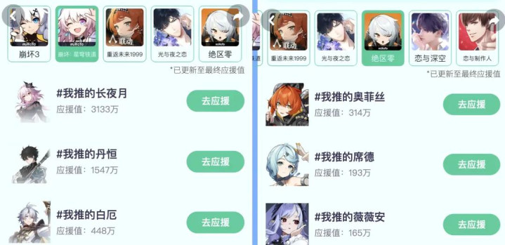 截图内容均为各个游戏应援扮装东谈主气TOP 3
