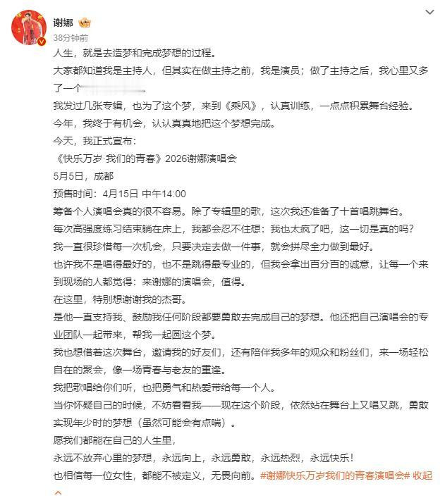 谢娜还感谢了老公张杰的维持与饱读吹:“在这里,很是思谢谢我的杰哥。是他一直维持我、饱读吹我任何阶段王人要勇敢去完成我方的梦思。他还把我方演唱会的专科团队一齐带来,帮我一齐圆这个梦。”