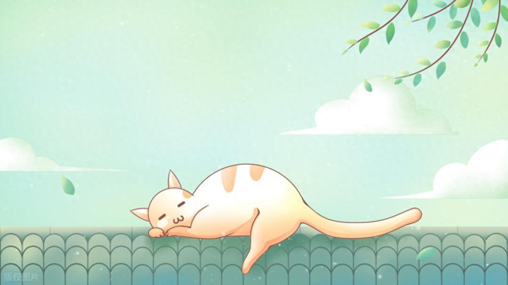 一只能人的橘猫,趴在屋顶的瓦片上睡觉,绿色唯好意思调整卡通插画