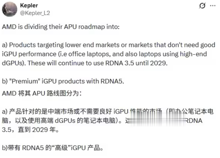 此前有不少爆料东谈主和媒体齐默示,AMD将来几年的APU的核显部分将会永久停滞于RDNA3.5架构,在性能上毫无寸进。而字据有名爆料者Kepler_L2的表现,AMD将依据居品定位与有洽商市集,决定其集成显卡的架构走向。AMD并非洽商在悉数APU上永久停滞于RDNA3.5架构,在中高端市集展望将会带来基于RDNA5架构的下一代核显居品。