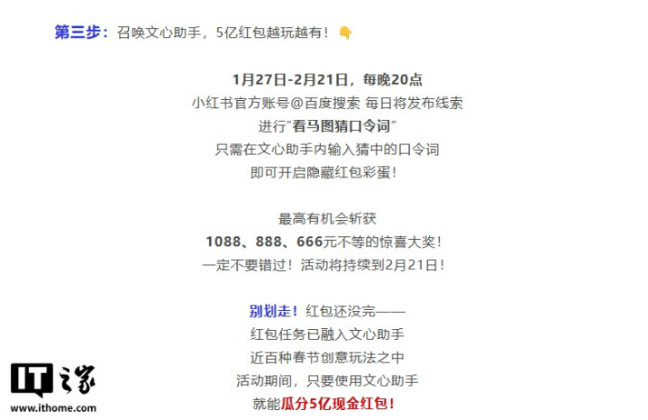 IT之家1月25日音尘,百度发布文心助手对于春节现款红包行动的见知。自1月26日至3月12日,用户在百度App使用文心助手,亚博体彩app有契机等分5亿现款红包,最高可得回1万元奖励。