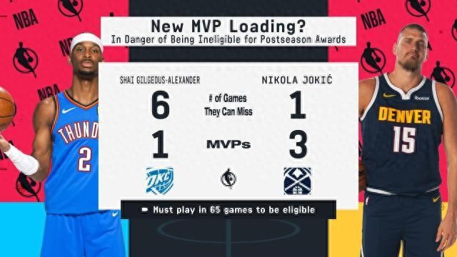北京时期2月28日,NBA官网更新最新一期MVP榜,亚历山大和约基奇赓续位列榜单的前二位,但两东说念主皆存在因场次不及无法参与MVP评比的隐患。适度当今,亚历山大最多还不错缺席6场比赛,约基奇最多还能缺席一场。