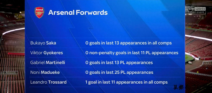 阿森纳对阵曼联的比赛中,枪手锋线再次交出了一张无语的收成单。萨卡全场隐身,特罗萨德毫无存在感,而替补登场的哲凯赖什也未能蜕变战局。赛后期间统计暴露,阿森纳全场控球率占优,但开放战射正次数却寥如晨星。