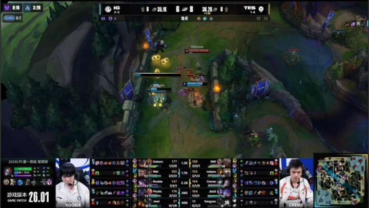 [30:02]Rookie辛德拉下路吃线被老9逮捕,TES趁便回头开老龙,正面naiyou潘森飞天勾通队友融解Soboro兰博,下路Photic落单被杀,TES打出0换3,回头吃掉老龙,经济跳动6k。