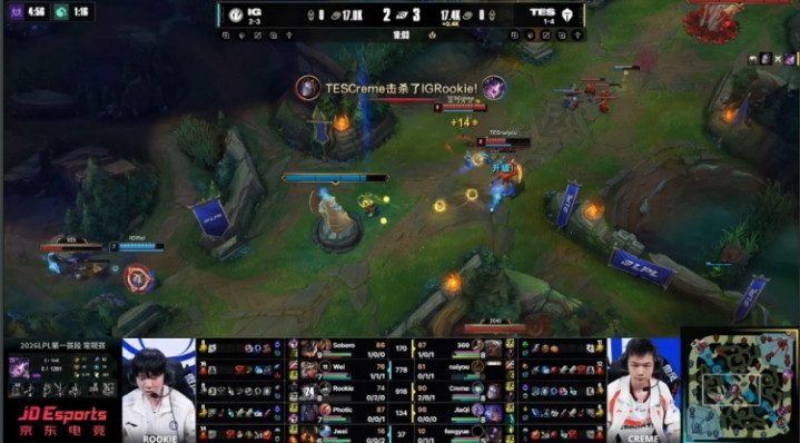 [14:58]Photic韦鲁斯中路占线被杀,同期Soboro兰博登程也被Creme勾通老9逮捕,TES打出0换2。