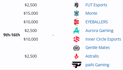 线上赛阶段的第9-16名队伍当中,除固定的26,250好意思元俱乐部奖金外,Monte得回最多的1.5万好意思元选手奖金,投注ppEYEBALLERS和InnerCircle各得回1万好意思元,FUT、Aurora、Astralis、paiN和GentleMates均只得回2500好意思元。