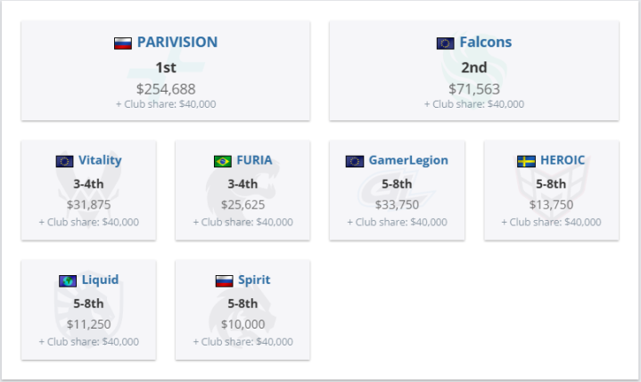 冠军PARIVISION:选手奖金254,588好意思元、俱乐部奖金4万好意思元