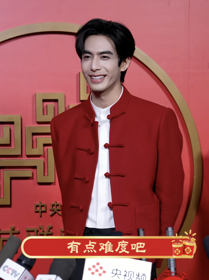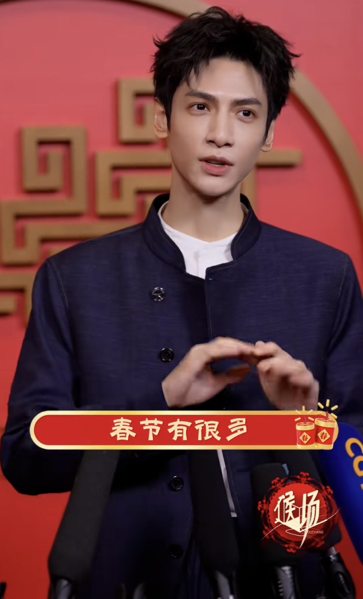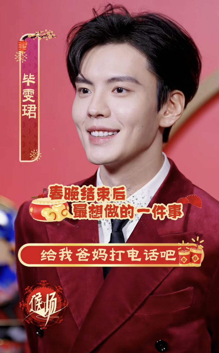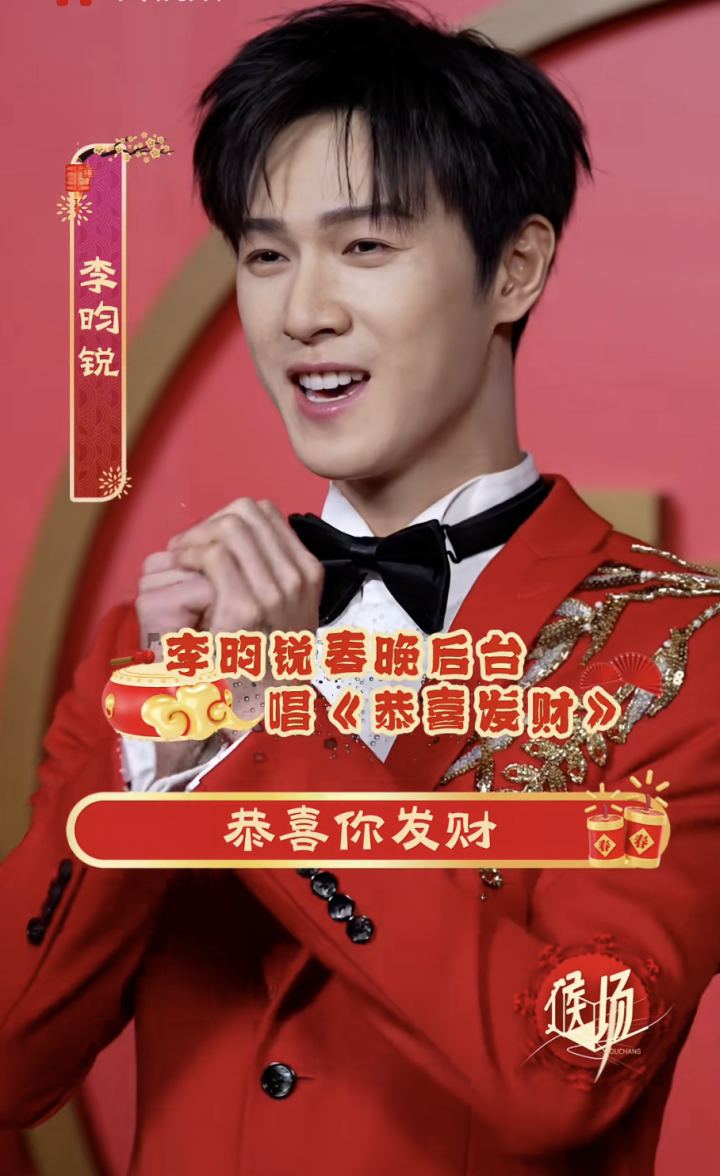领有一对笑眼的他在后台唱起了《恭喜发家》,一稔红色西装,笑得两眼弯弯,真喜庆。