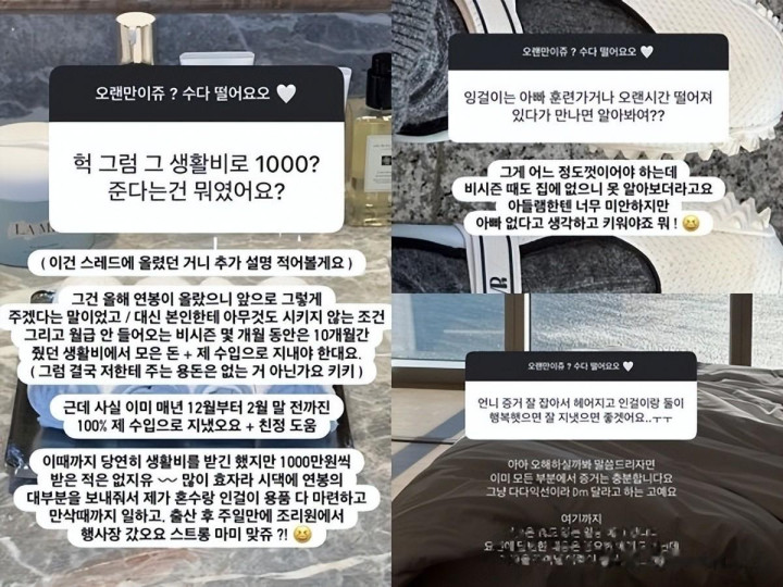 金智妍25日上昼在我方的SNS上与粉丝们进行了问答(Q&A),并走漏妻子研究不圆满,接连提到了婚配活命中履历的矛盾。对于活命费问题,她见地:“每年12月至2月末,我皆是100%靠我方的收入和娘家的匡助渡过的。天然收了活命费,但莫得每东谈主收过1000万韩元。”