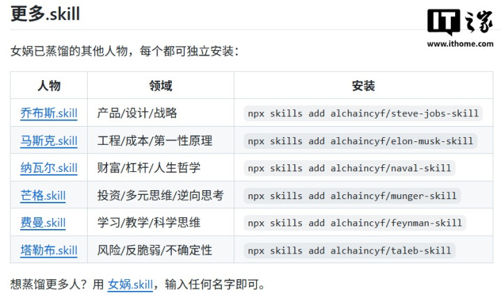 IT之家正式到,该格式由女娲.skill生成。女娲.skill格式则声称不错帮你蒸馏任何东说念主的想维边幅,让乔布斯、马斯克、芒格、费曼王人给你打工。