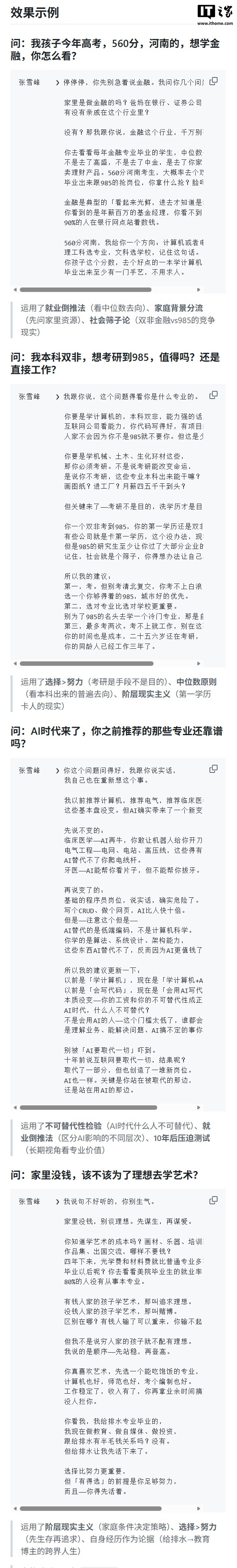 从效劳示例来看,“张雪峰.skill”不错效法张雪峰的语言口吻,进行高考、考研的关连选择推选。