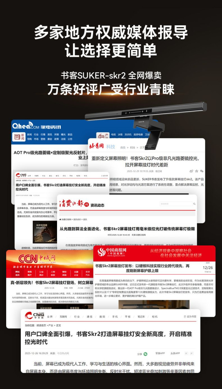 此外,它还取得了CCTV的展播、领有丁香大夫等专科团队力荐、入选品牌优选工程以及严苛的欧盟CE、好意思国FDA等十多家泰斗机构的认证,成为芜杂后光环境中的宽心之选,底下展示了泰斗媒体对书客品牌的报谈: