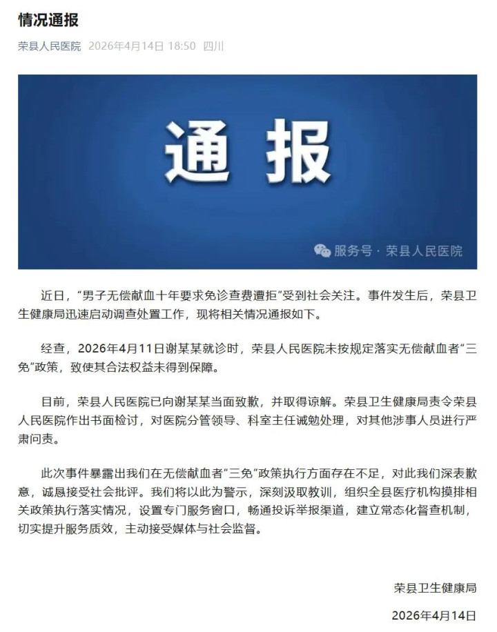 经查,2026年4月11日谢某某就诊时,荣县东谈主民病院未按次序落实无偿献血者“三免”策略,甚而其正当权柄未得到保险。